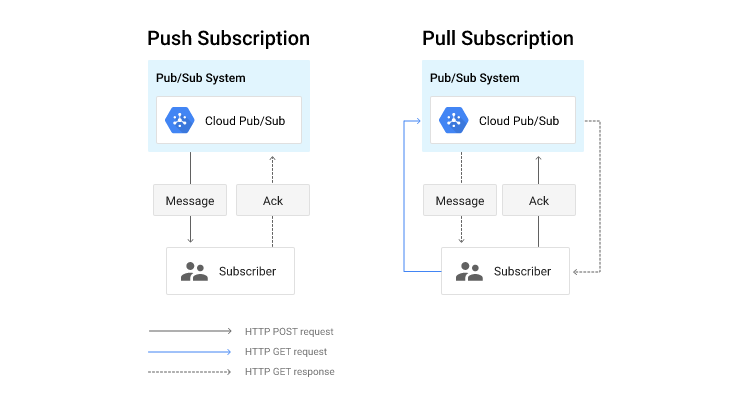 This document gives an overview of how subscriptions work in Google Cloud Pub/Sub. For details on pull and push delivery subscriptions, see the Pull Subscriber Guide and the Push Subscriber Guide.